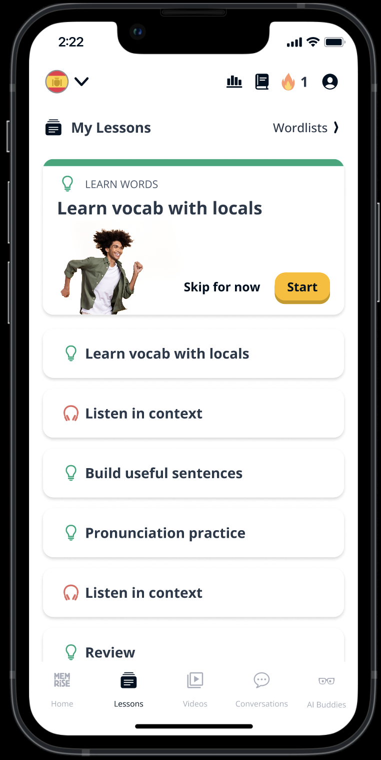 Las lecciones son secuencias estructuradas de actividades de aprendizaje. Incluyen una combinación de tipos de contenido, como Aprendizaje, Revisión, Construir oraciones, Pronunciación, Vídeos y Conversaciones. ¡El objetivo es mantener tu práctica variada para que puedas usar el idioma con confianza en situaciones reales!